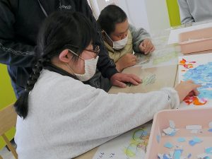 みなさんに折り紙を色ごとにわけて小さくちぎってもらい、その後下絵に合わせてのりで貼り付けてもらいました!