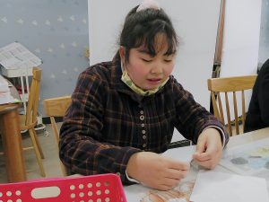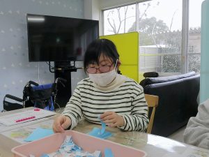 みなさんに折り紙を色ごとにわけて小さくちぎってもらい、その後下絵に合わせてのりで貼り付けてもらいました!