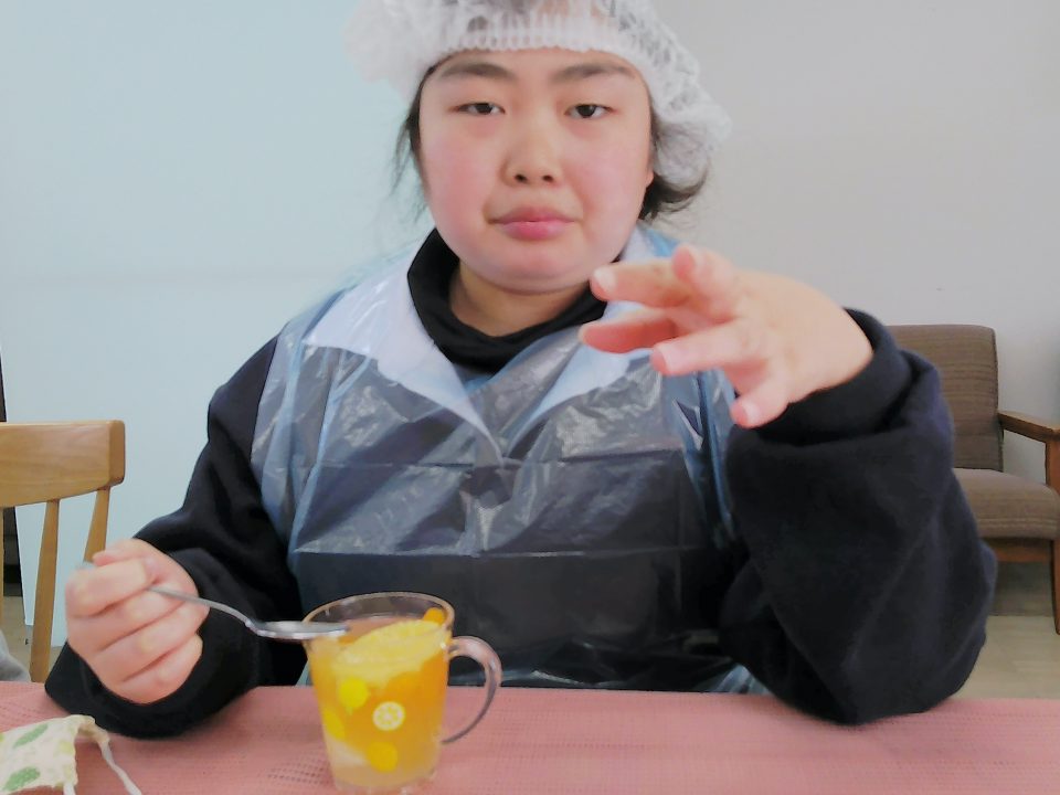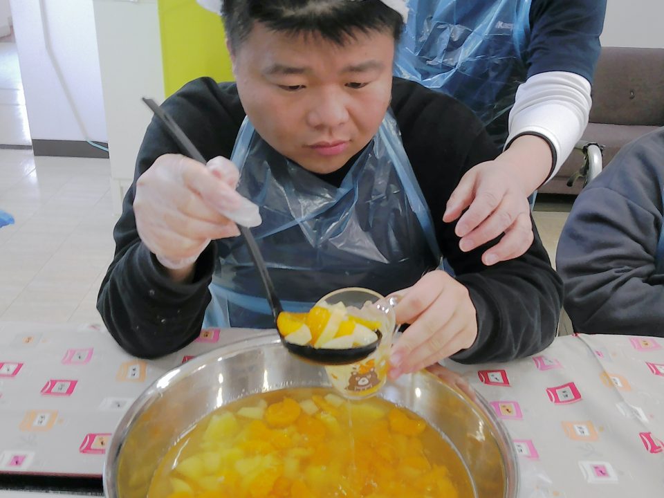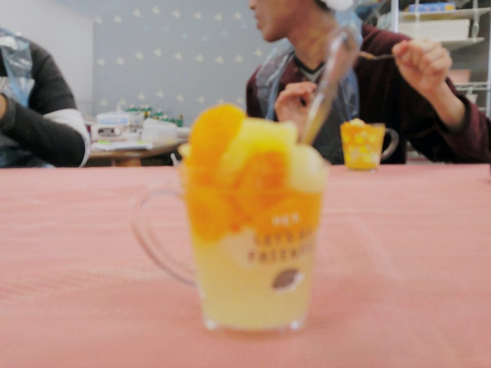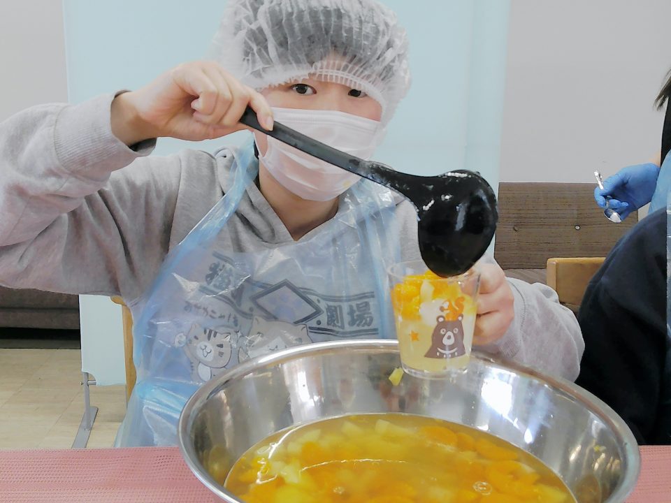 そしてジュースのゼリーや先程自分たちでカットした果物を器に入れて完成です✨✨