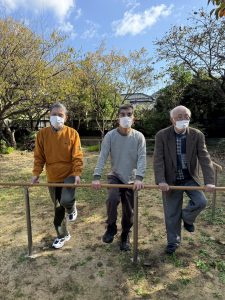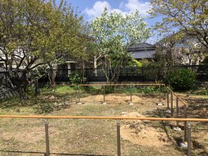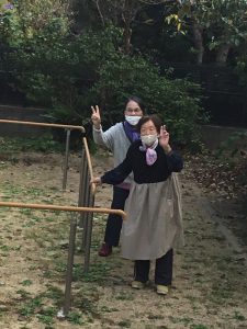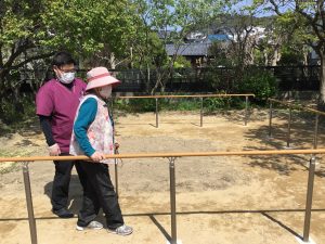 風の丘の裏庭には歩行訓練用のバーが設置してあります。